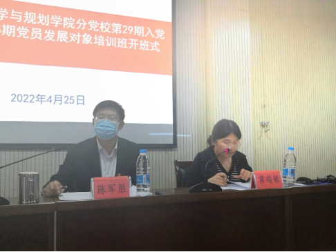 分党校第二十九期入党积极分子暨第十五期发展对象培训班开班式在学院二楼报告厅举行。学院党委书记陈军胜参加开班式并作培训第一讲,副书记李应海作动员讲话,学生工作办公室主任常瑞敏主持开班式,44名入党积极分子和13名发展对象参加本次开班式。