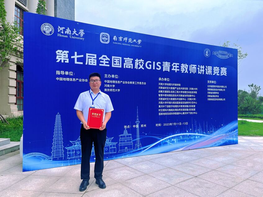 2023年7月11-13日,第七届全国高校GIS青年教师讲课竞赛在河南大学(郑州校区)成功举办。嗨皮漫画 遥感与地理信息工程系教师李吉龙博士参加竞赛,并荣获一等奖。