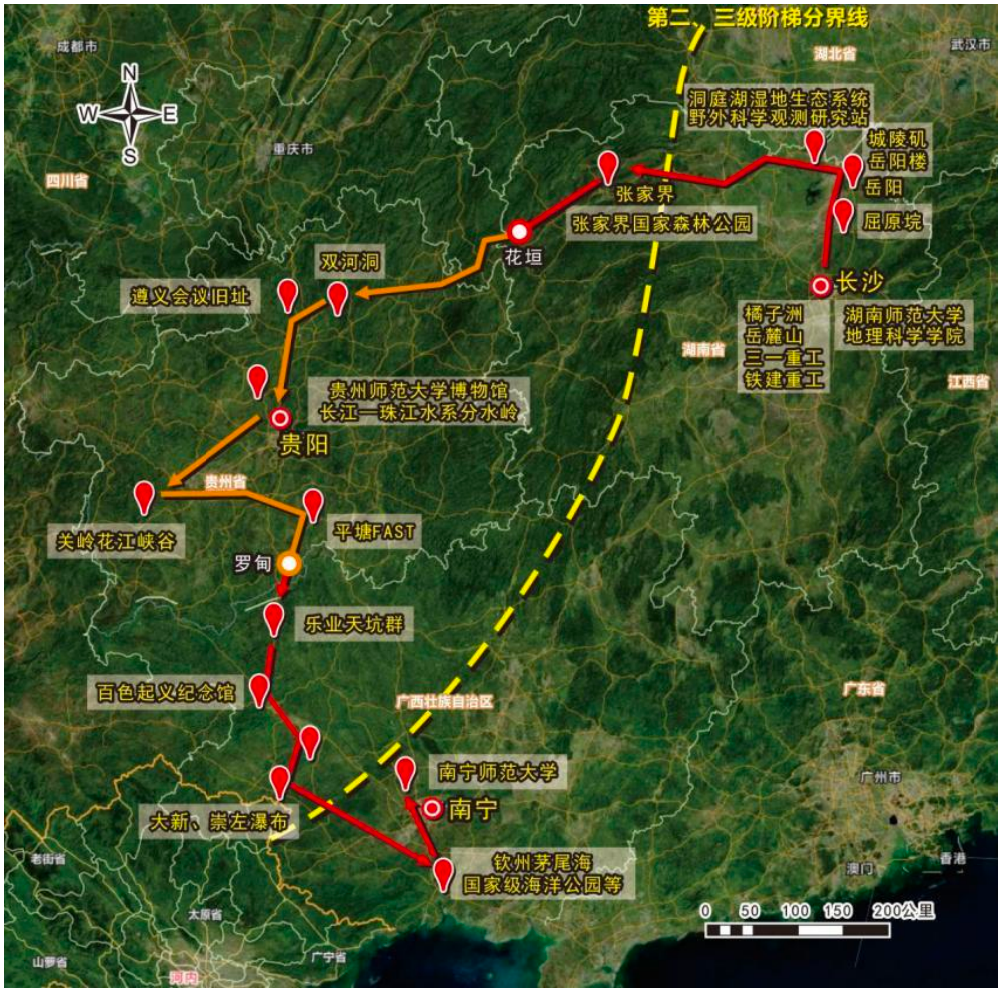 湖南段实习以全国首批历史文化名城长沙的山水洲城格局、历史文化特色与重要产业集群、洞庭湖区的复杂江湖关系与人地系统、张家界地貌的形成过程及张家界国家森林公园的保护与利用为主题,学习岳麓书院、岳阳楼的历史沿革、总体格局及文化传承和保护;长沙山水洲城的空间格局、演化过程及其形成机制;三一重工、铁建重工智能制造的核心技术、产业链布局以及未来发展趋势;城陵矶港对洞庭湖生态经济区及长江经济带建设的作用;岳麓山地质现象与地质构造演化;橘子洲的演化过程及其利用与保护;湘江洪涝灾害的治理与城市防洪体系;洞庭湖堤垸所体现的复杂人地关系、人水关系;洞庭湖与长江之间的江湖关系演变及其影响;金鞭溪U型谷的成因和发展演化趋势;黄石寨土壤和植被的垂直地带性分异特征等内容。丰富的实习内容进一步强化了同学们的地理学思维,提升了理论与实践相结合的专业素养。