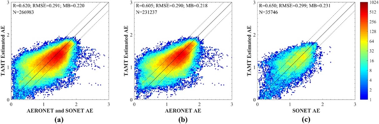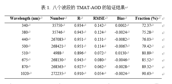 �о�������2019�����꣨ÿ10���ӣ���Himawari-8/AHI�۲����ݺ�SONET��AERONETվ������ܽ��۲⡣����Transformer��ÿ���ʱ���������ݽ�������ģ�ͣ���ʹ������Ĥ����ȥ���Ƶ�Ӱ�죬��ѵ�������л������˶Բ�ͬ����AOD��С��ϵ������Լ�����о�ʹ���˶�����֤���Զ�ģ�ͺͷ��ݾ��Ƚ���ϵͳ���������������TMAT�㷨��������AOD���ݾ��ȣ���������RMSE��Ϊ0.101�����ϵ��R�ﵽ0.949��81.69%�ķ�����������Χ�ڣ�ͼ1����������������AOD���ݶ����нϸ߾��ȣ���1�������ڶನ��AOD����õ���?ngstr?mָ����AE��Ҳ��ػ�վ����нϺ�һ���ԣ�ͼ2����RΪ0.620��RMSEΪ0.291��