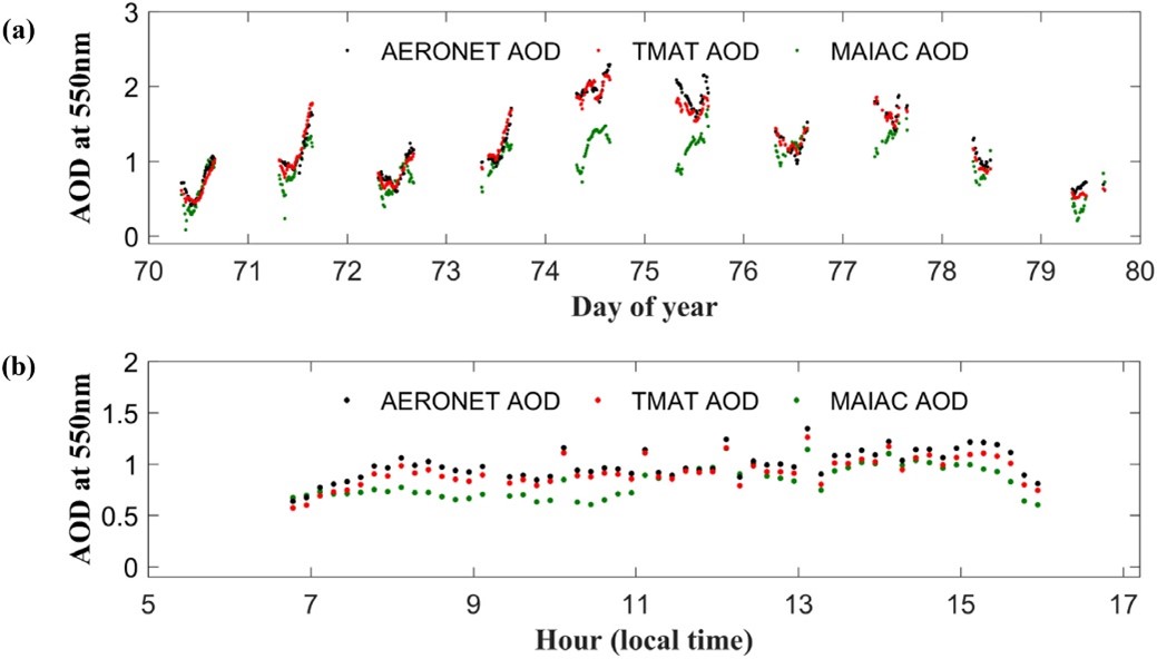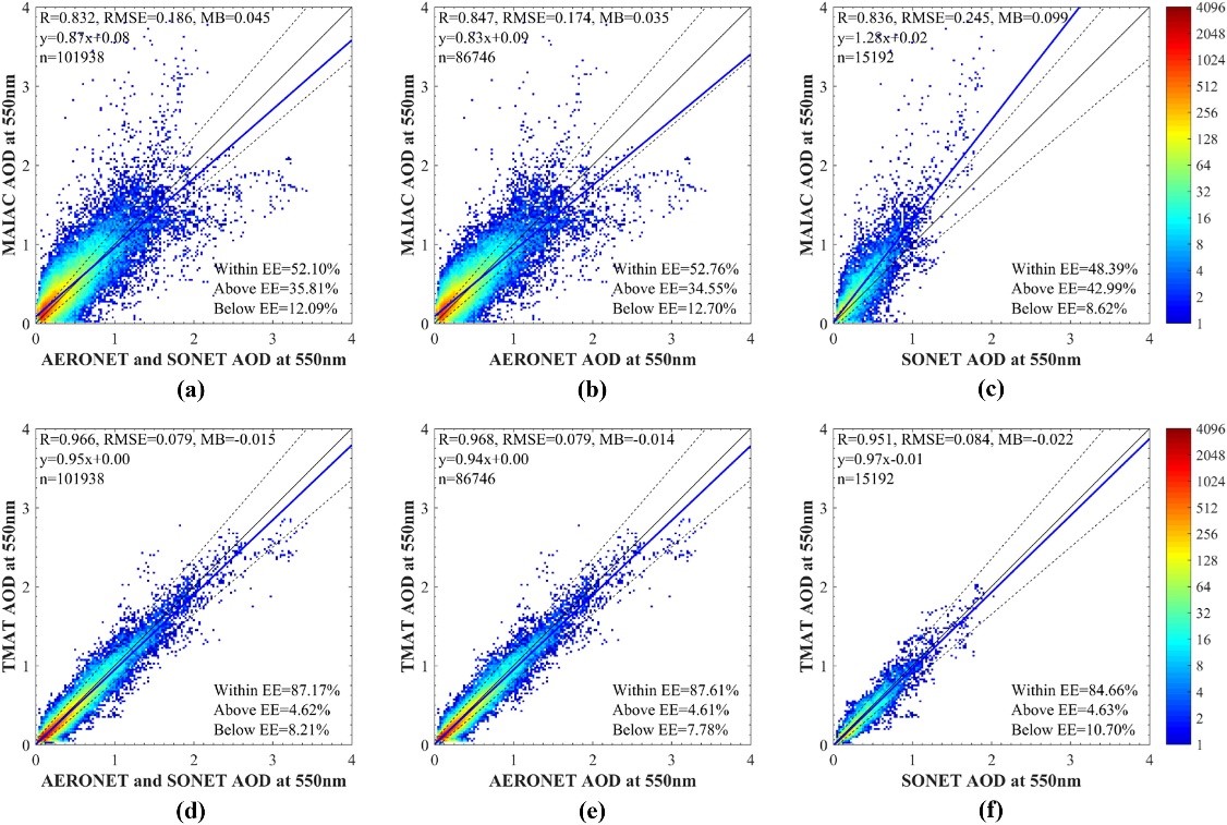 ͼ3. TMAT-AOD��AHI-MAIAC AOD����֤�Ƚϡ����У�AHI-MAIAC AODΪ����AHI���ݺ�MAIAC�㷨���ɵ�AOD���ݼ���