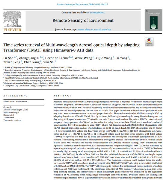 ���ø�ʽ��Lu She, Zhengqiang Li, Gerrit de Leeuw, Weile Wang, Yujie Wang, Lu Yang, Zixian Feng, Chen Yang, Yun Shi, 2024. Time series retrieval of Multi-wavelength Aerosol optical depth by adapting Transformer (TMAT) using Himawari-8 AHI data, Remote Sensing of Environment, 305, 114115.