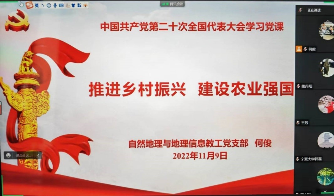 习近平总书记在党的二十大报告中强调:“全面推进乡村振兴,坚持农业农村优先发展,坚持城乡融合发展,畅通城乡要素流动,扎实推动乡村产业、人才、文化、生态、组织振兴。”为了深入学习领会党的二十大精神,把理论学习成果转化为具体行动,11月9日下午,自然地理与地理信息教工党支部书记何俊同志以“推进乡村振兴,建设农业强国”为题线上为大家讲授党课。