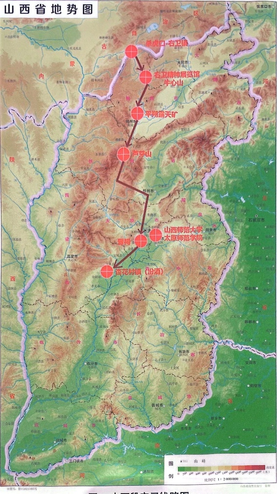 8��7����8��11�գ���ʮ����ȫ����У����ѧ����Ұ��ʵϰ��������ɽ��ʡ����ʼ��Ϊ��5���ɽ����ʵϰ��ɽ������·���������������ͽ��еġ�����ɽ�ӵء����������塱Ϊ��ɫ������·��Ϊ������-˷��-����-Ì«Ô����ͼ1��ʾ����