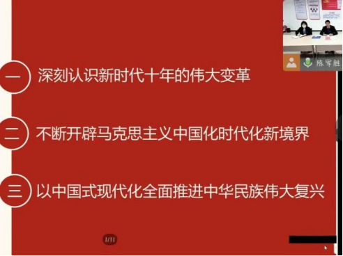 开班式结束后,陈军胜作题为《深入学习贯彻党的二十大精神》开班第一讲,并从深刻认识新时代十年的伟大变化、不断开辟马克思主义中国化新境界、以中国式现代化全面推进中华民族伟大复兴三个方面展开讲述。他着重强调,马克思主义真理力量激活了中华文明,中华优秀传统文化滋养丰富了马克思主义。