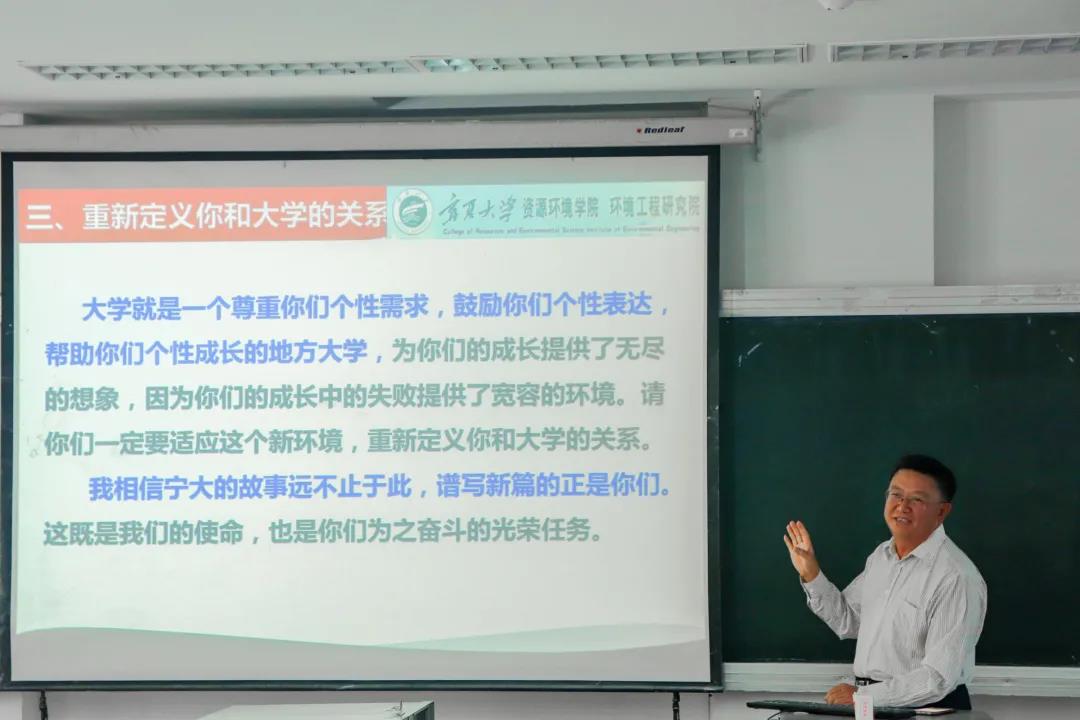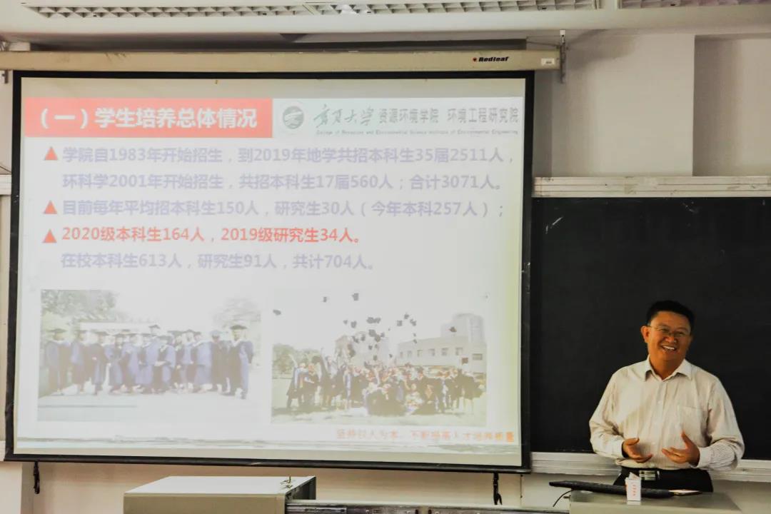 环境工程研究院的简介和新生寄语。讲座伊始,孙院长代表学院对全体2020级新同学的到来表示热烈欢迎。在介绍完“两院”概况、师资队伍、学生规模后,介绍了学院自“十一五”至“十三五”期间以来,取得的重大科技成就。他指出,学院总体发展目标将在2030年前上升至西部院校排名的第4名,以建设成区域特色鲜明、服务地方能力突出、西部一流教学的研究型学院为奋斗目标。最后,用“富有创新思维是不竭动力”、“勤奋、诚实是一切的基础”、“共同成就是追求的目标”、“用心去感受,用真情去交流”、“胸怀天下决定你的未来”这五个观点来指导同学们在大学期间能够重新定义自己的生活,在未来谱写自己的新篇。